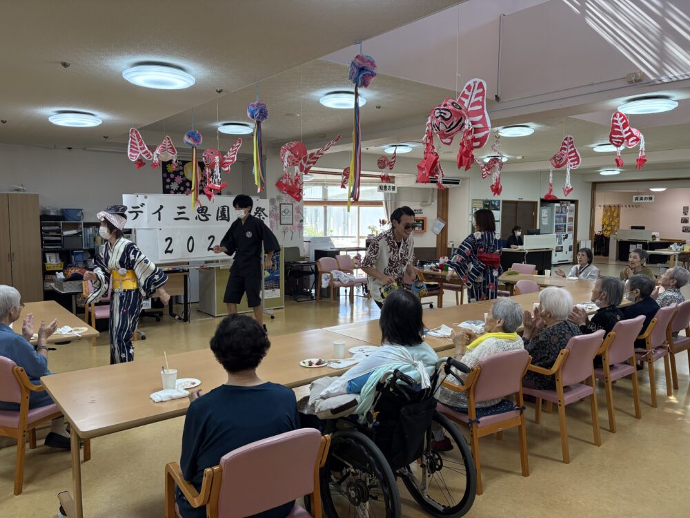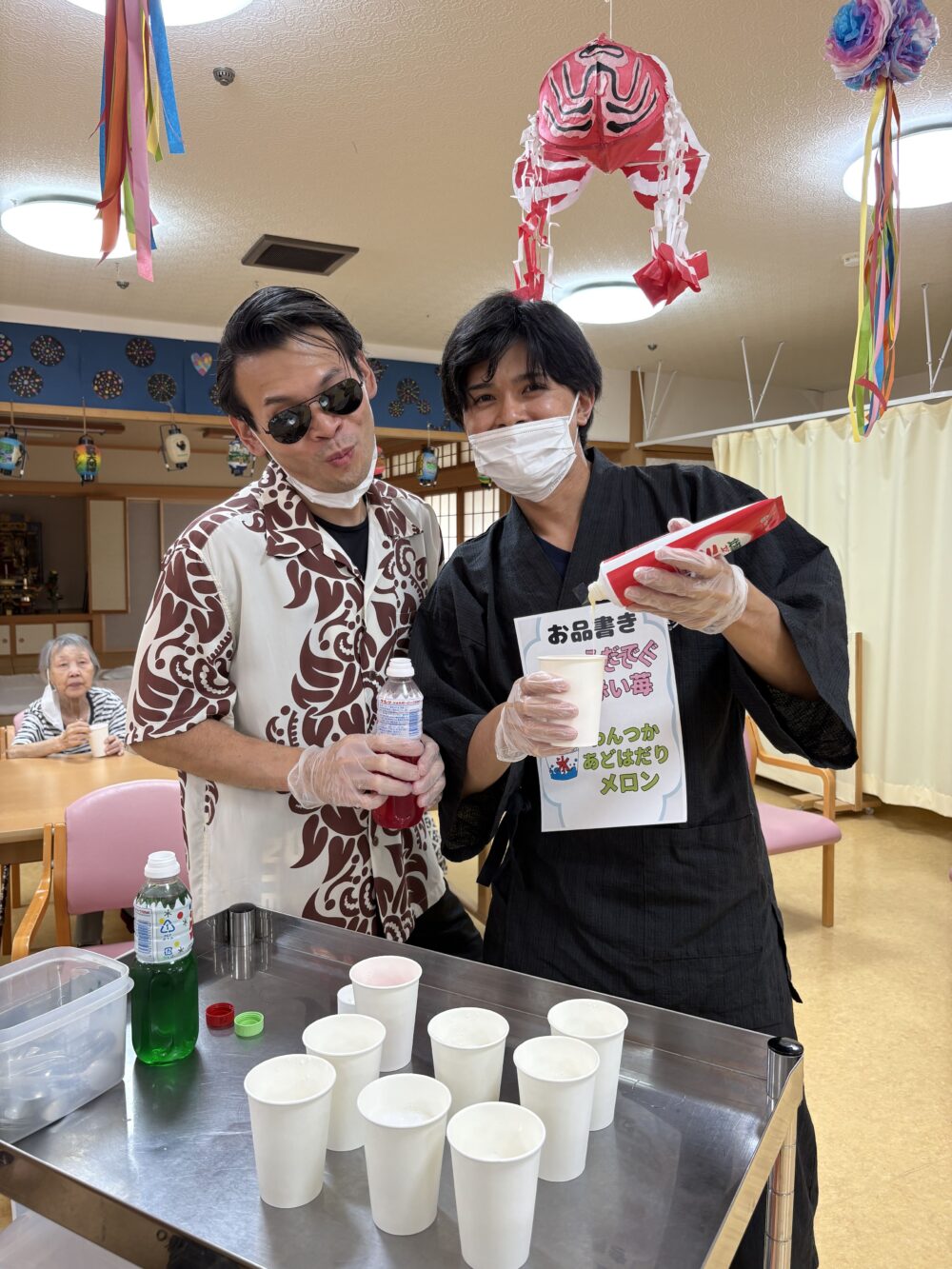 職員も甚平や浴衣に着替え、会場も祭りの雰囲気が漂い利用者様もワクワク♬