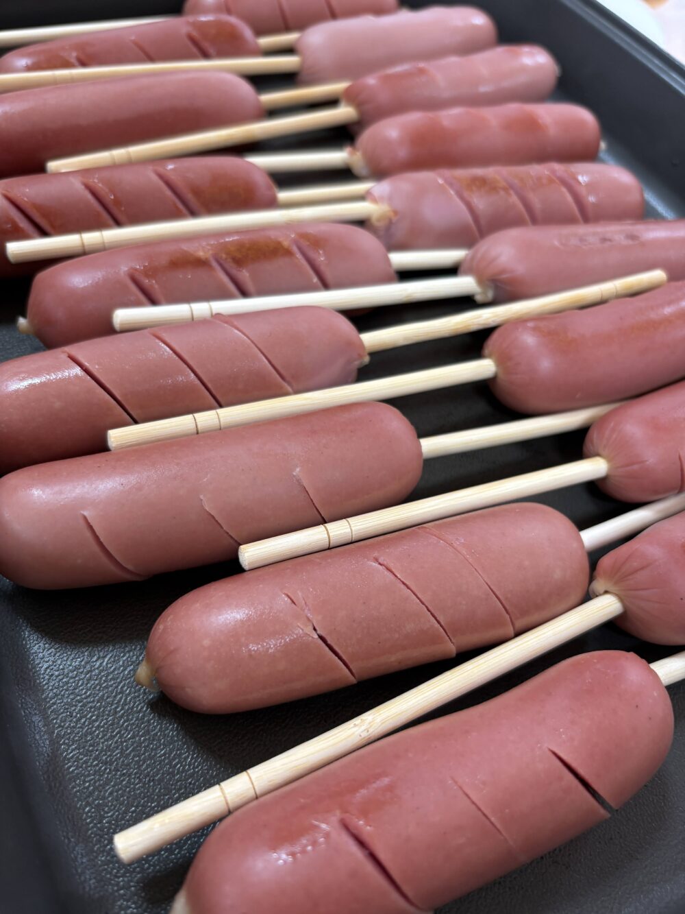 ケチャップを沢山かけて職員とフランクフルトで乾杯🥂
