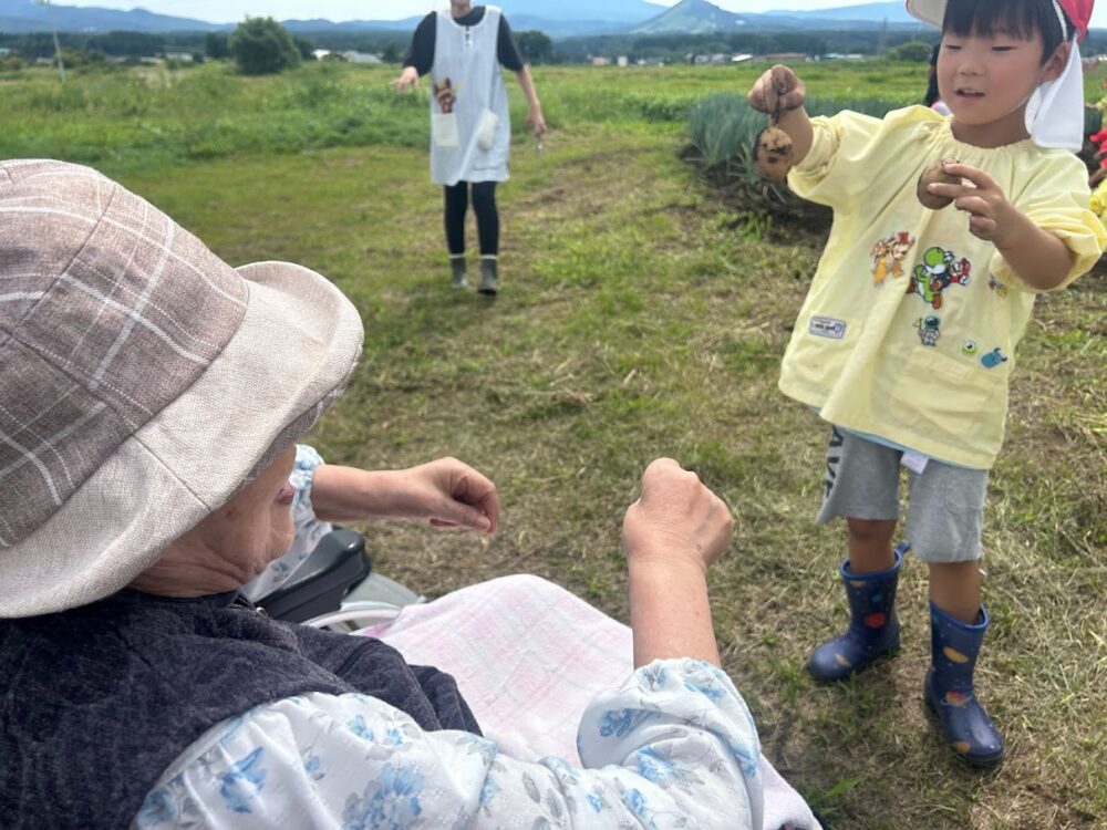 大きなじゃがいもが掘れると、見学していた利用者のもとへ嬉しそうに見せに来てくれる園児たち♪