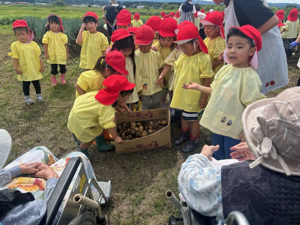 暑い中でも一生懸命にじゃがいも掘りを頑張った園児たち。楽しそうな表情や一生懸命な姿を見て、私たちも元気をもらうひとときとなりました。来年はじゃがいもを一緒に植えたり、掘ったじゃがいもで一緒に料理をしたいな~…(^^♪