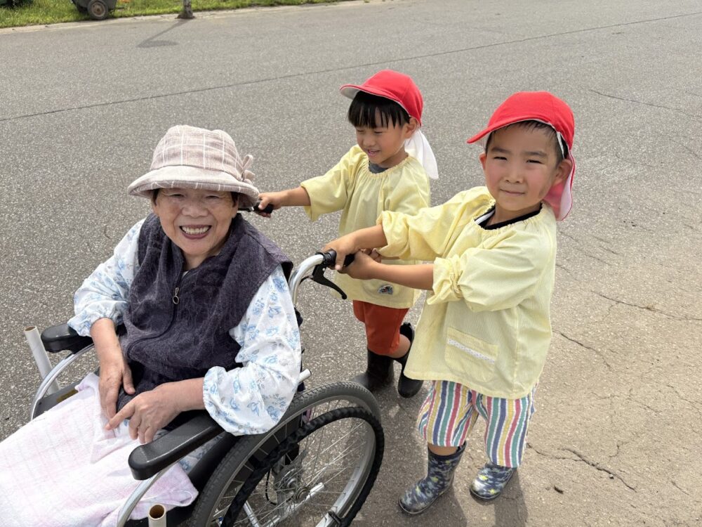 じゃがいも掘りのあと、園に戻る道のりでは、園児が利用者の車いすを押して手伝ってくれる姿が見られました。
