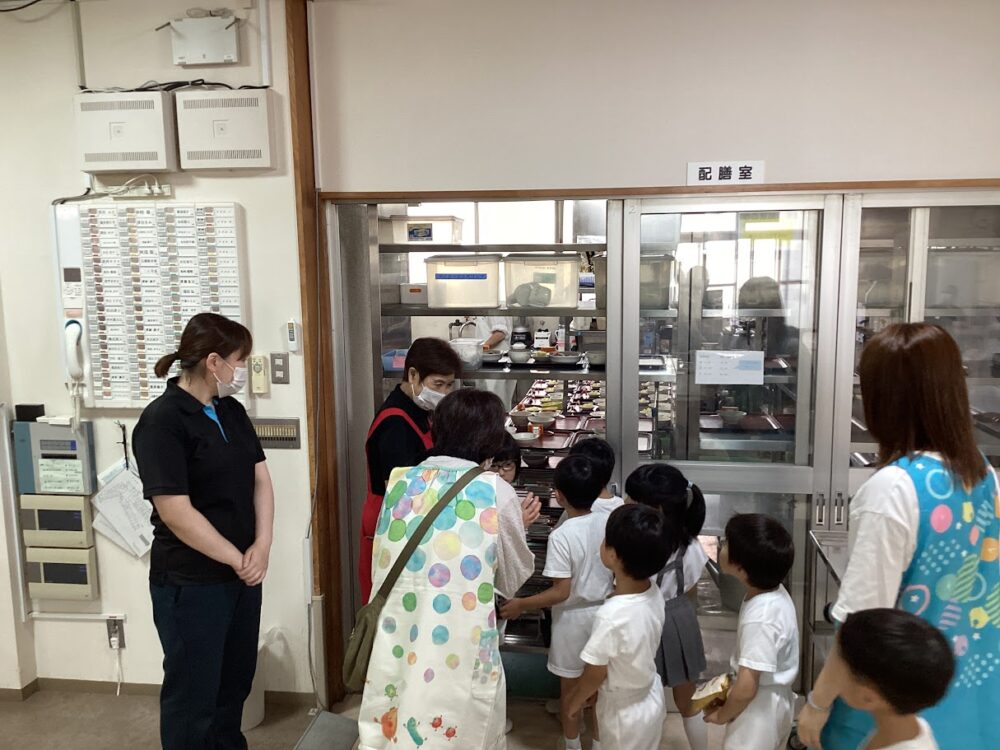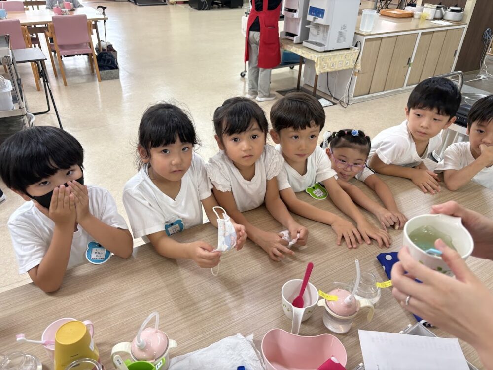 嚥下調整食(ソフト食・ミキサー食)、介護用エプロン、吸い飲みなど、園児たちにとっては初めてのものばかり👀