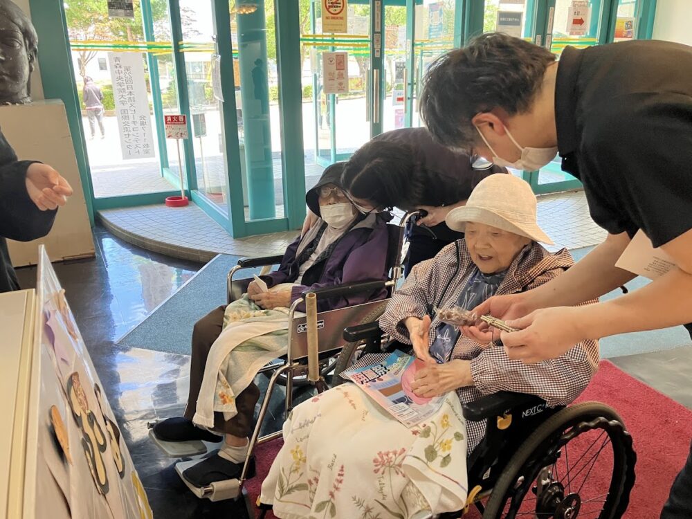 「食べへ、食べへ!」と、声をかけながら、心のこもった試食を一人ひとりに手渡してくださいました。その温かなやりとりに、自然と心が和むひとときに…