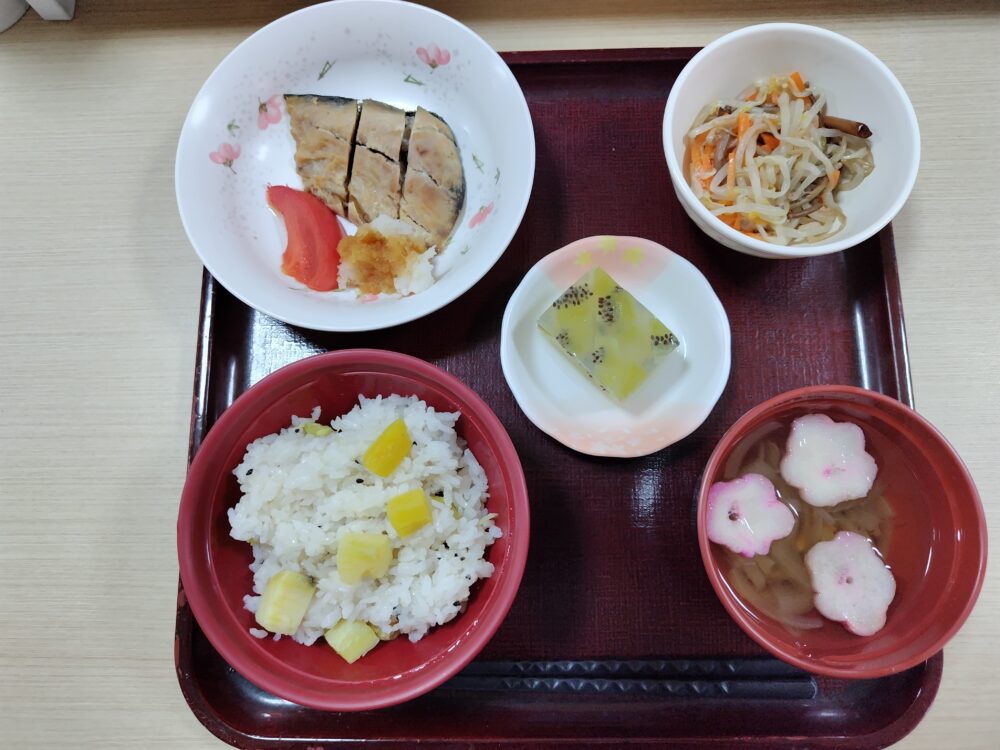 11/7 さつまいもご飯、サバの粕漬焼き、もやしのナムル、花麩のすまし汁、キウイの寒天よせ🥝